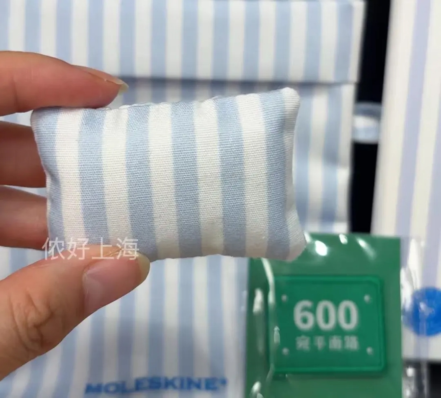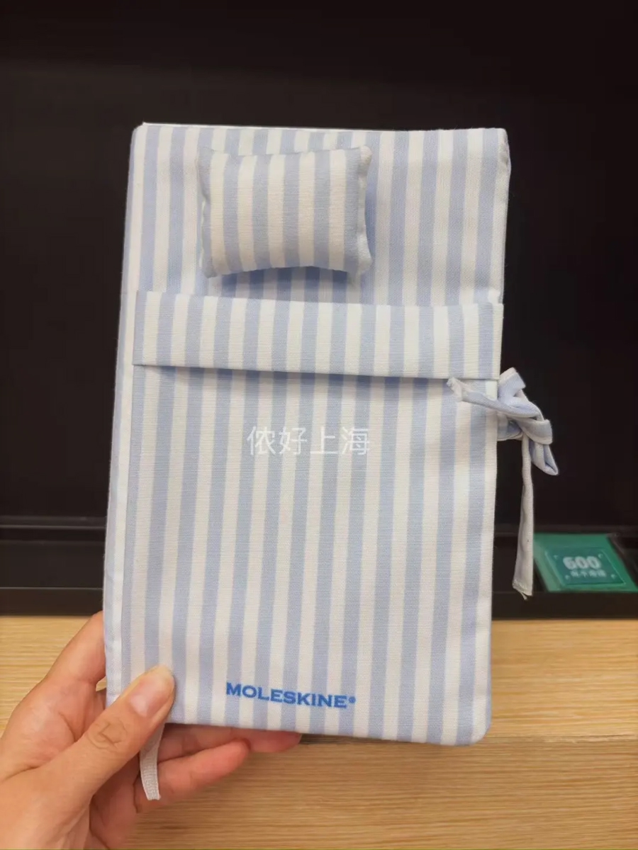 封皮是布艺的,白底配浅蓝条纹,配色很像“病号服”,还做成了一张床的模样——有枕头、有被子。