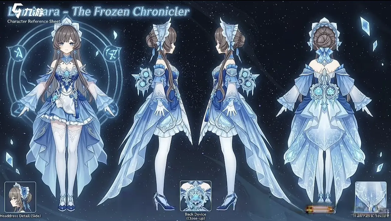 与早期主线剧情中的实机模型相比,这版二创建模在保留其标志性小裙子与女仆头饰的同时,进行了全面“仙气升级”。服装采用清新的蓝白渐变色调,裙摆与饰物上点缀着冰雪般的纹理,完美契合其冰元素设定。背后的发条装置也革新为更精密、华丽的冰系机械结构,整体气质从以往的“傲娇小太妹”转向了梦幻甜美风,令人眼前一亮。